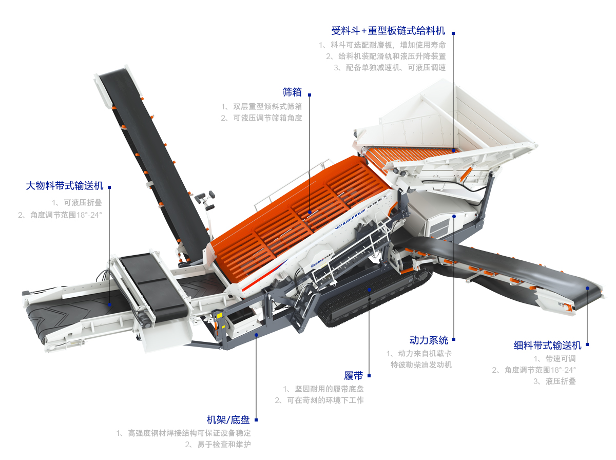 履帶式設(shè)計使得篩分站可以在各種地形和環(huán)境中靈活移動,方便在不同地點進行篩分作業(yè)。同時,履帶式移動篩分站的移動速度和定位精度也得到了有效保障。